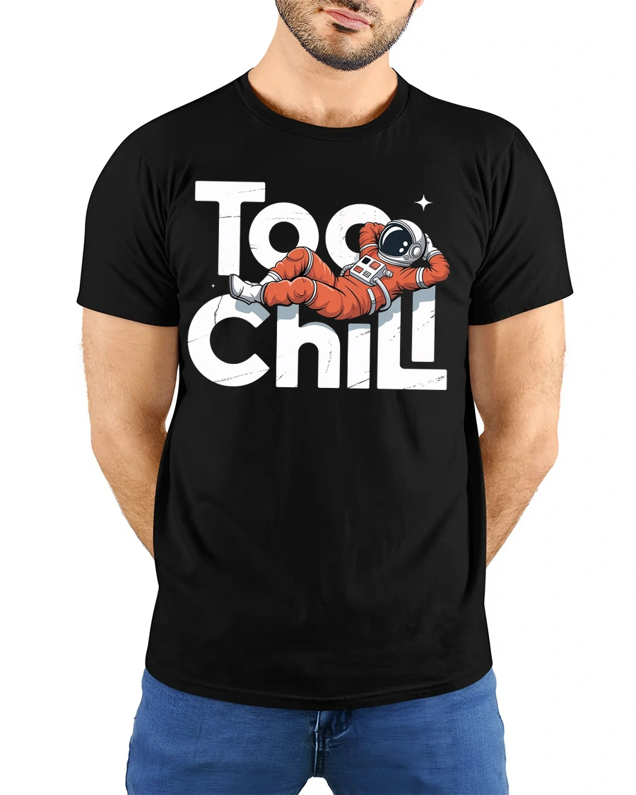 Too Chill Astronaut Relaxing Funny Space Graphic T Shirt - model wearing black tee with hands behind back