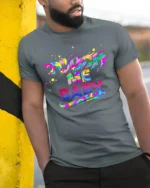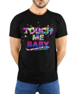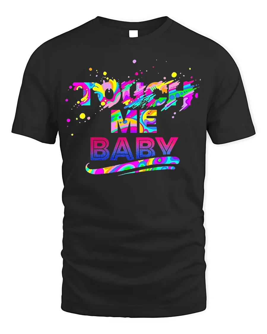 Turn heads with this Touch Me Baby Retro Color Splash Funky Graphic T-Shirt, a bold statement piece for those who love expressive, colorful fashion.