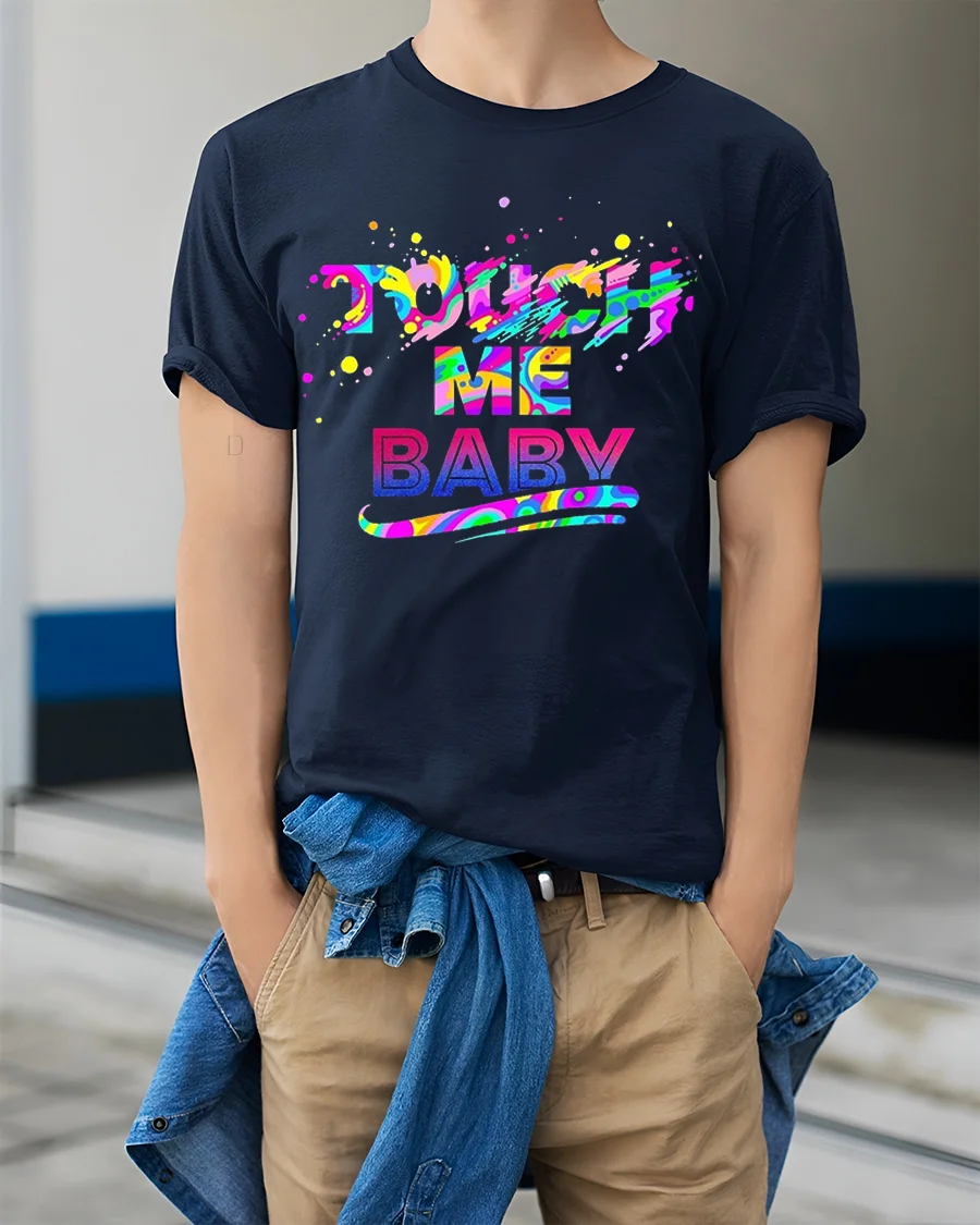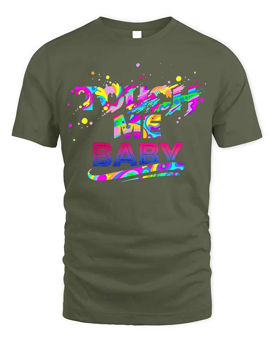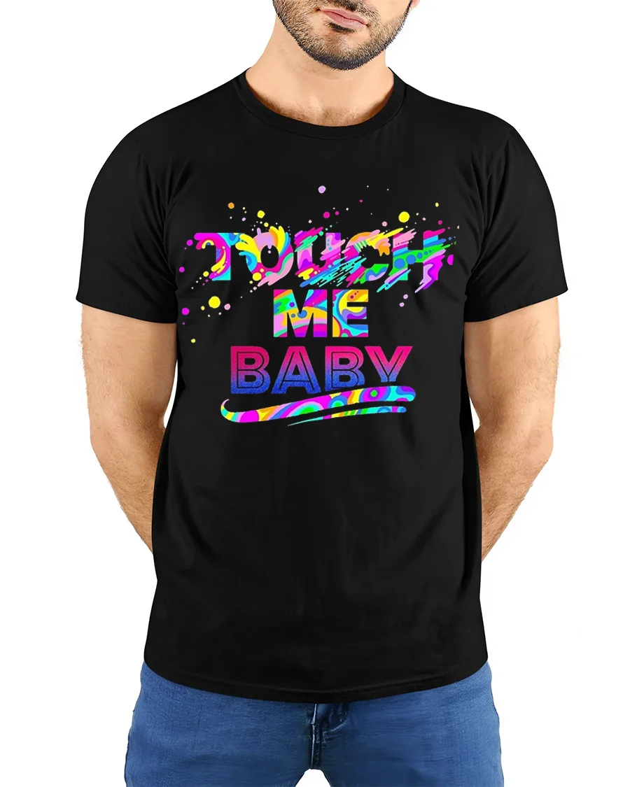 The Touch Me Baby Retro Color Splash Funky Graphic T-Shirt pairs effortlessly with jeans, joggers, or a casual jacket for a standout streetwear look.