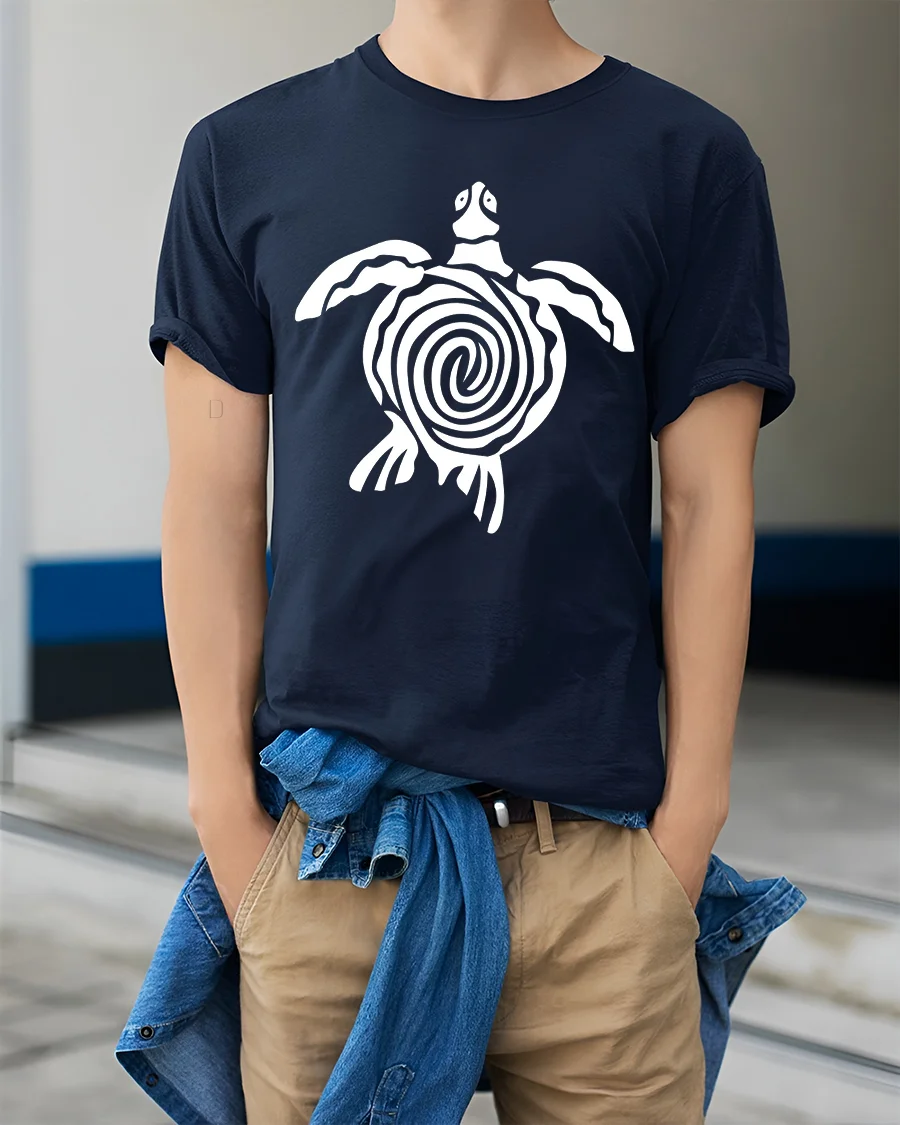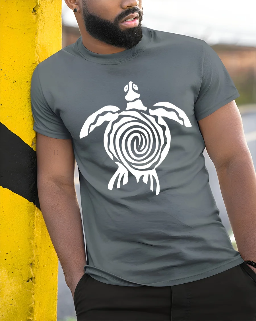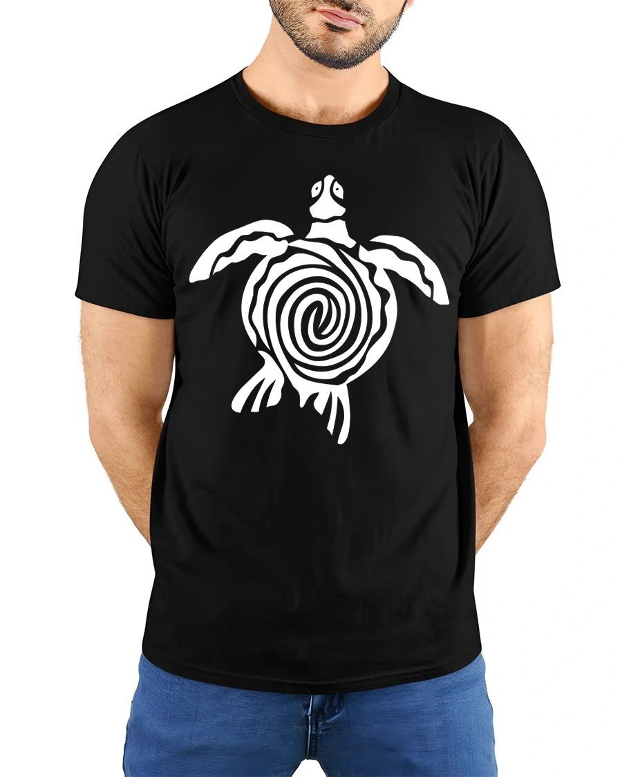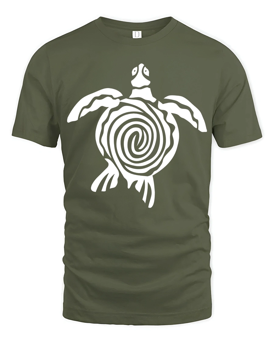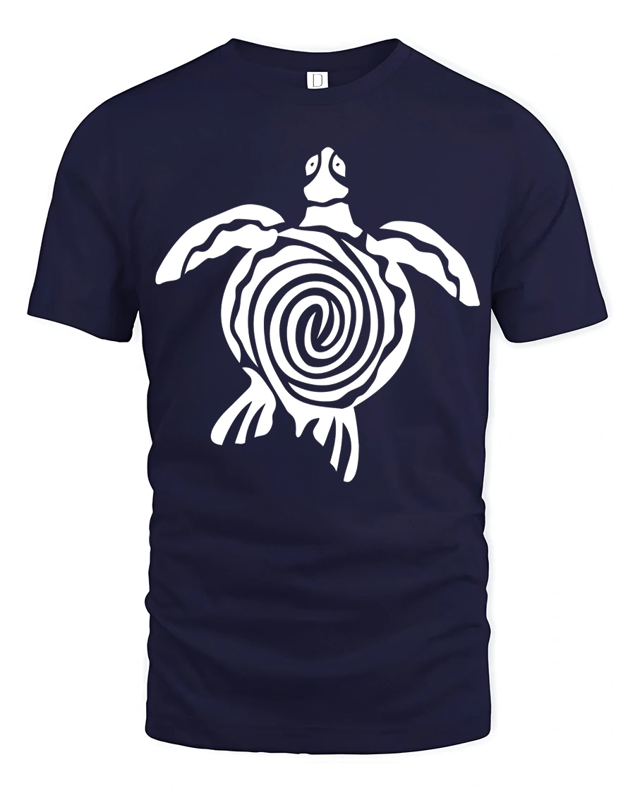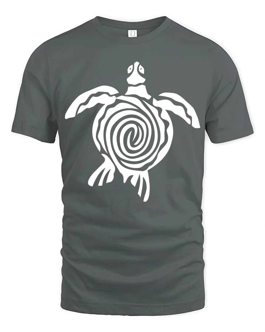 Tribal Sea Turtle Ocean Animal Symbol Graphic Tee Tshirt features a stylized spiral turtle illustration inspired by marine life symbolism and artistic coastal design themes.