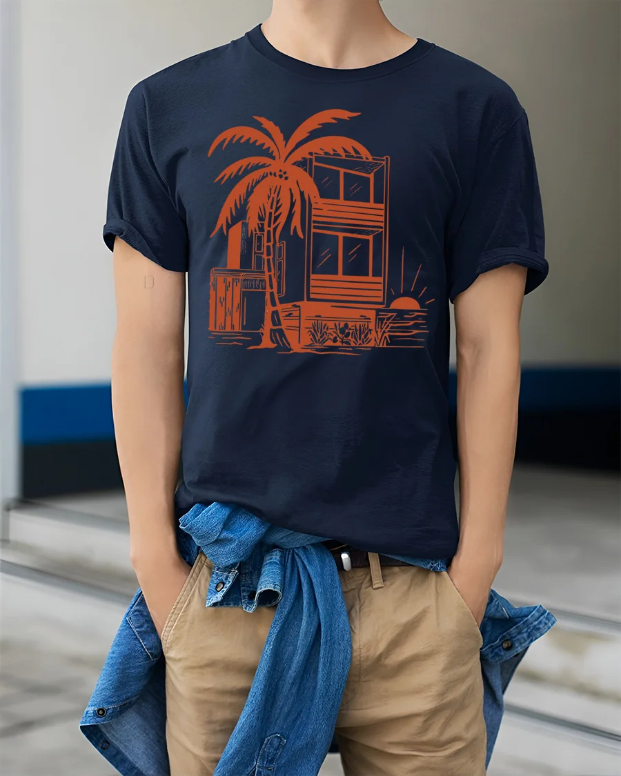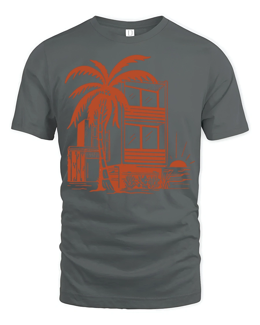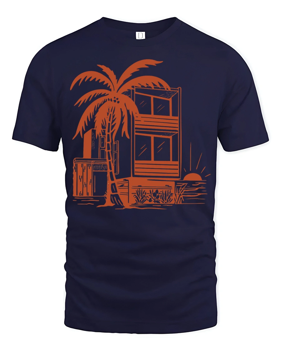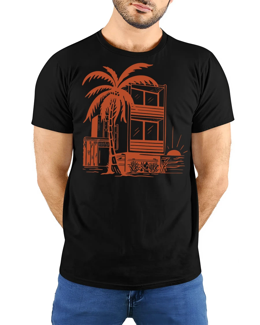 Tropical Beach House Sunset Palm Tree Vacation Graphic Tee Tshirt captures the calm beauty of a seaside escape with a stylish artistic touch.