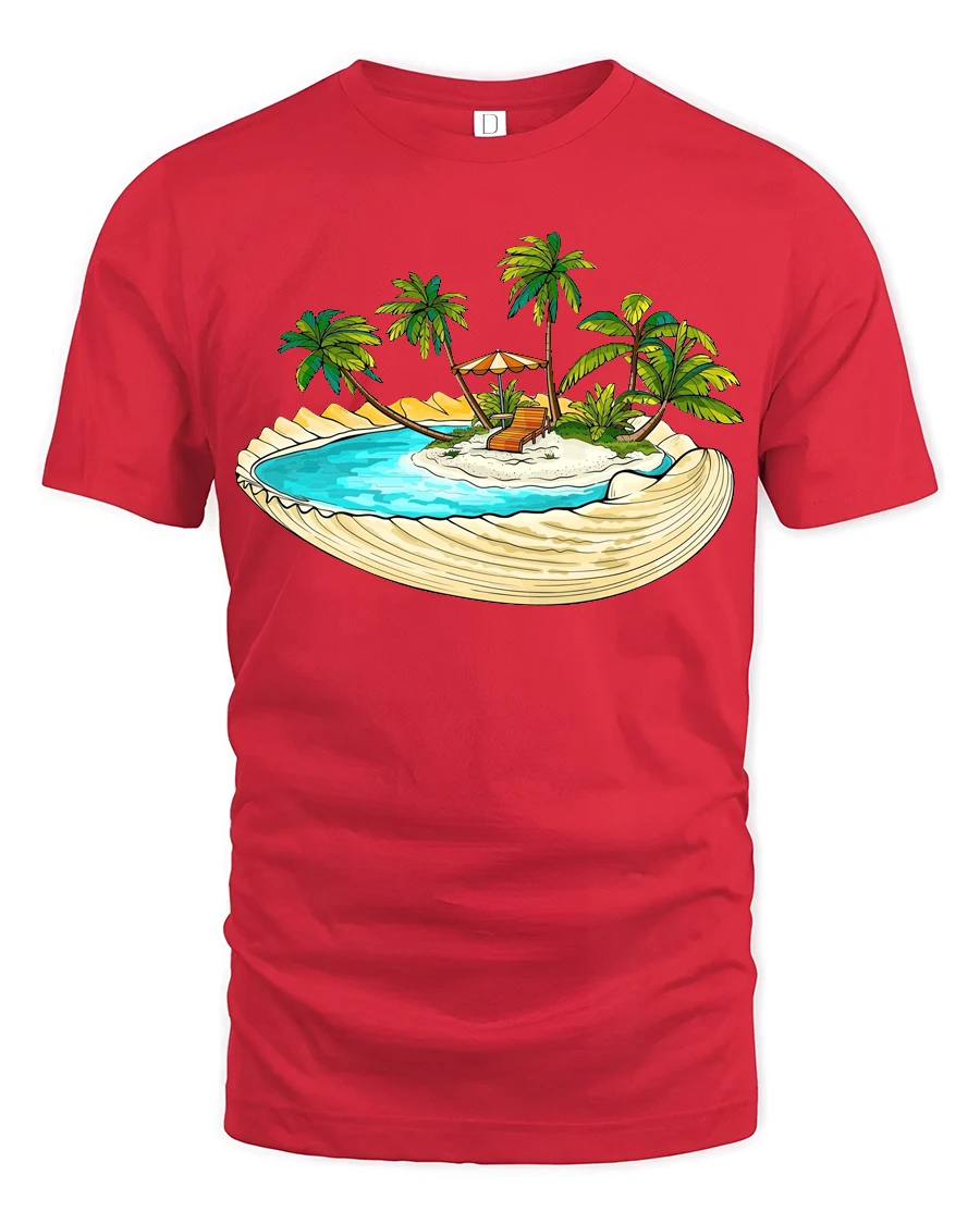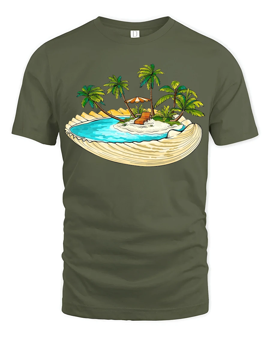 Tropical Island Shell Beach Vacation Aesthetic Graphic Tee Tshirt presents a creative illustration of a peaceful island scene placed inside a detailed seashell creating a dreamy coastal inspired visual concept.