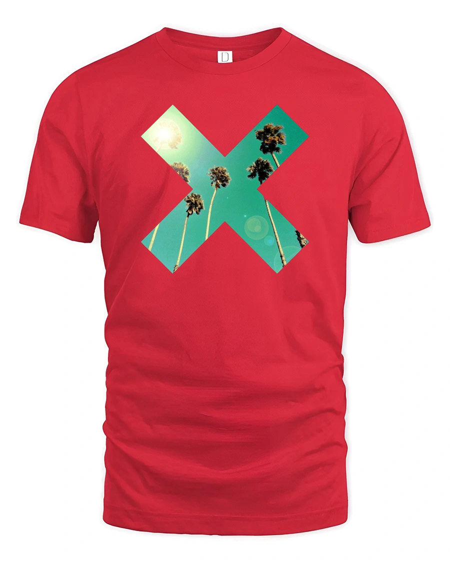 Tropical Palm X Graphic Tee Retro Summer Sunset Vibes Tshirt - red t-shirt on white background