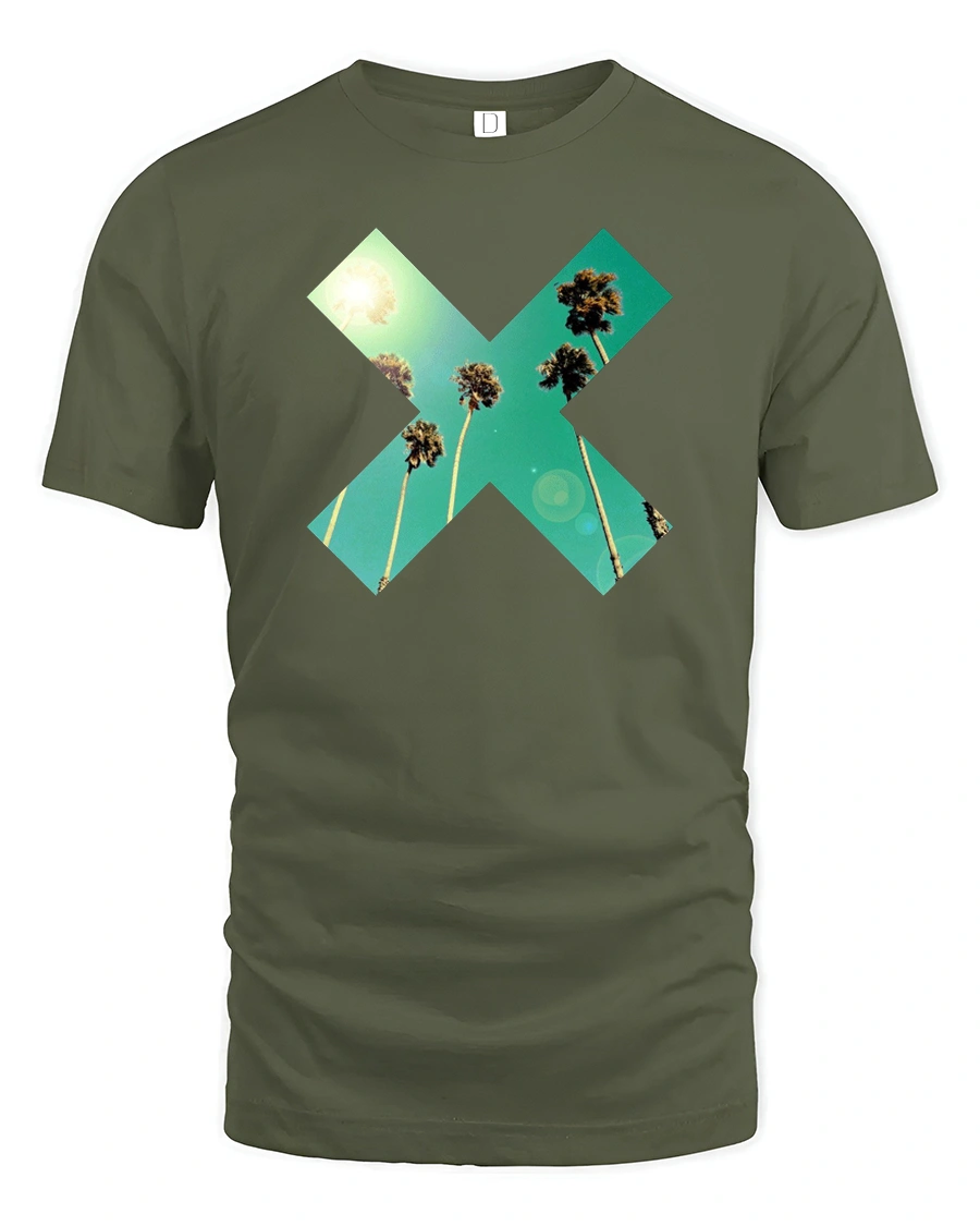 Tropical Palm X Graphic Tee Retro Summer Sunset Vibes Tshirt - military green t-shirt on white background