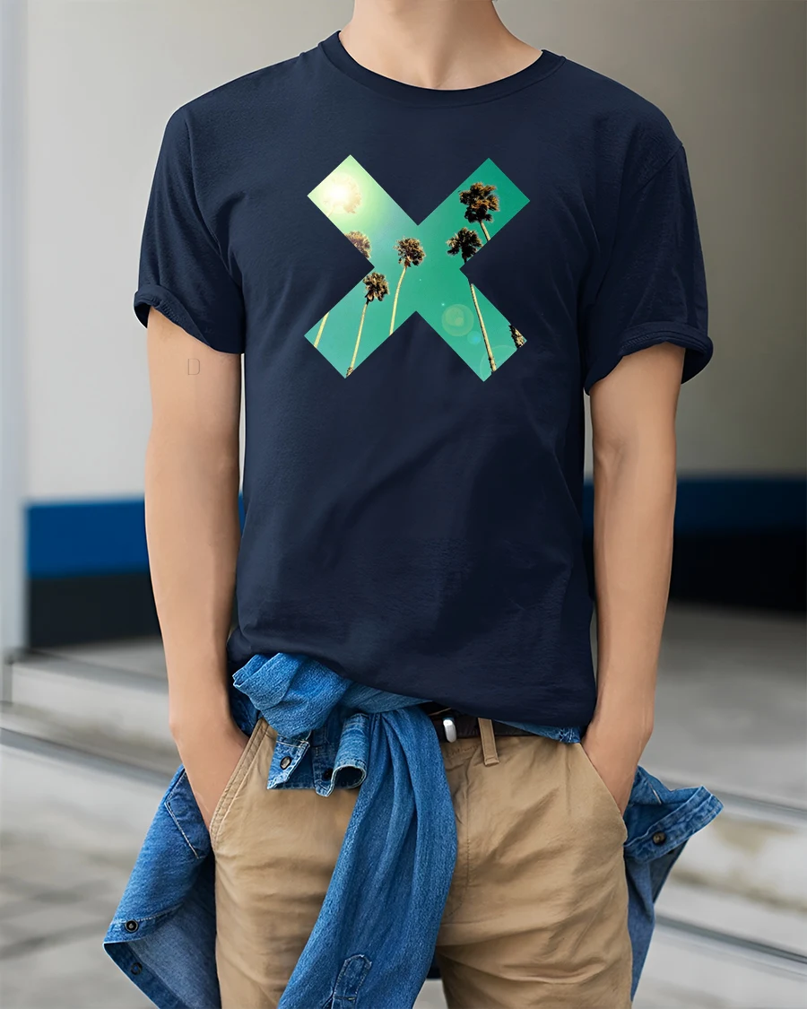 Tropical Palm X Graphic Tee Retro Summer Sunset Vibes Tshirt - model wearing navy tee with hands in pockets