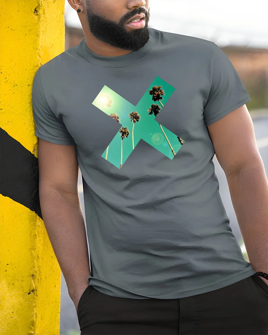 Tropical Palm X Graphic Tee Retro Summer Sunset Vibes Tshirt - model wearing grey tee, leaning on column