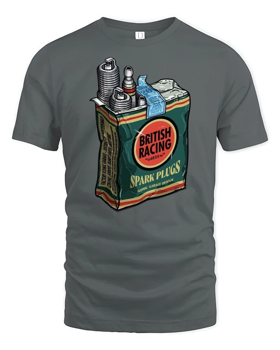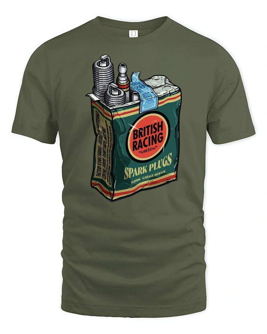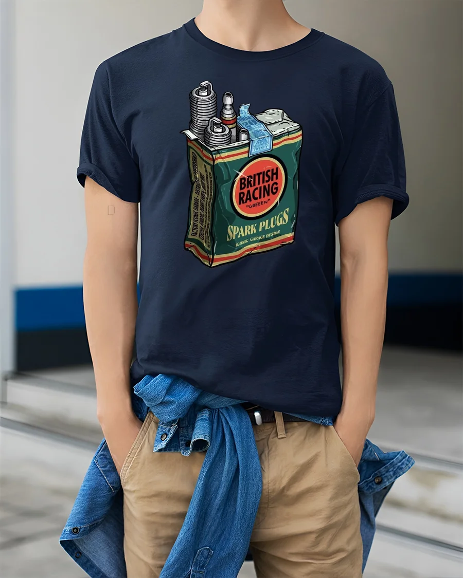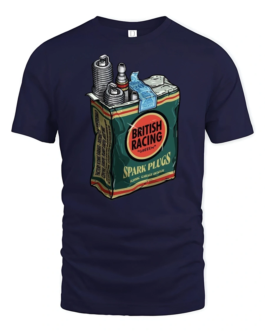 Vintage British Racing Spark Plugs Garage Style Graphic Tee Retro Tshirt delivers a bold classic look inspired by automotive heritage and garage culture.