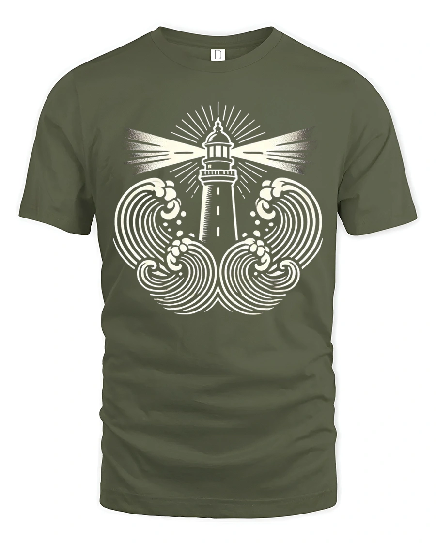 Vintage Lighthouse Ocean Waves Graphic T Shirt Nautical Tee - military green t-shirt on white background