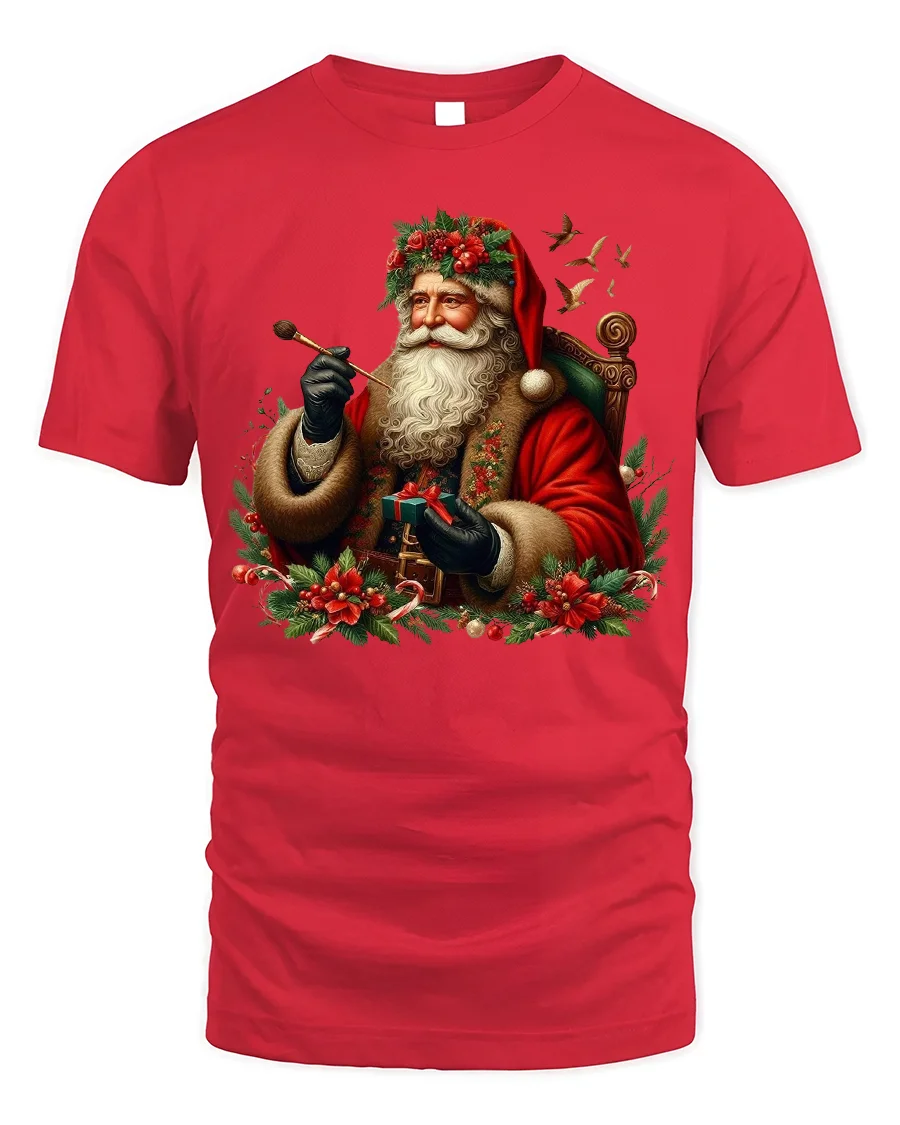 Vintage Santa Claus Christmas Holiday T-Shirt brings timeless holiday charm to your wardrobe. Featuring a beautifully detailed illustration of Santa Claus dressed in his traditional red coat with fur trim, surrounded by festive holly, bows, and candy canes, this design captures the warm nostalgia of Christmas celebrations. Santa’s jolly face and vintage style bring a classic holiday feel, making this tee a standout piece for the festive season.