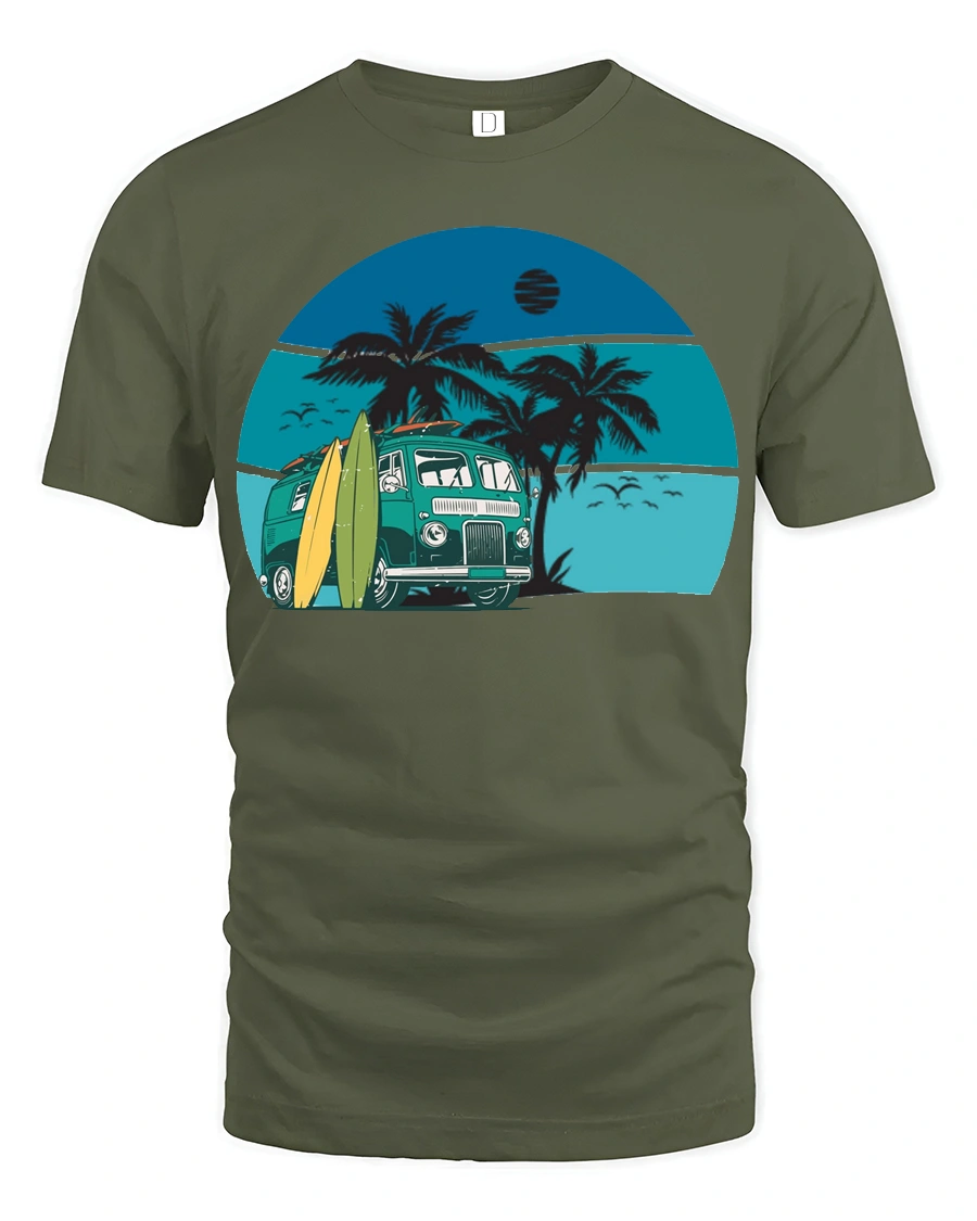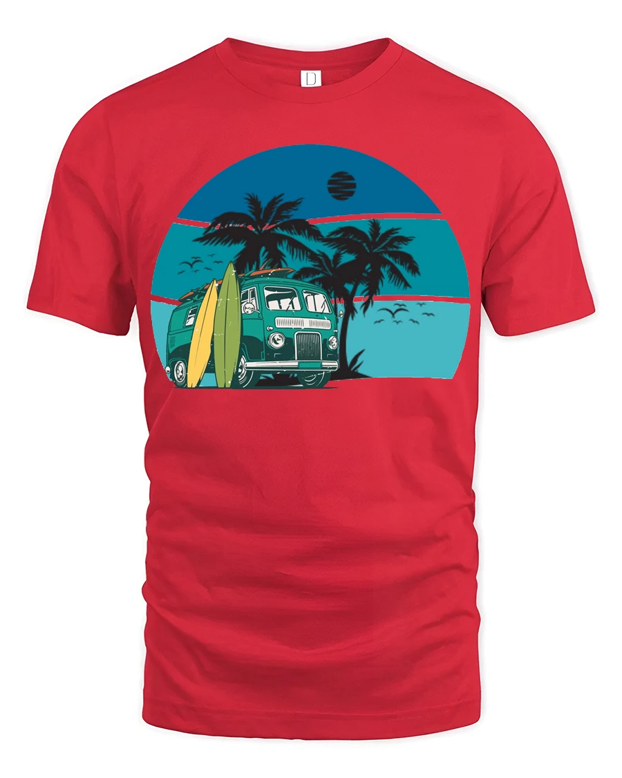 Vintage Surf Van Beach Sunset Graphic Tee Retro Summer Style captures the freedom of coastal adventures and relaxed seaside living.