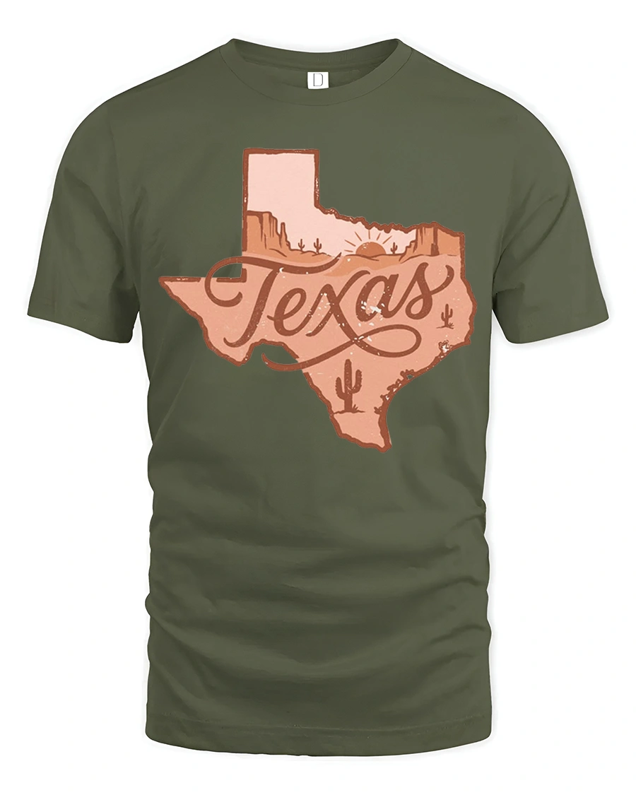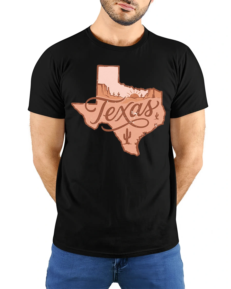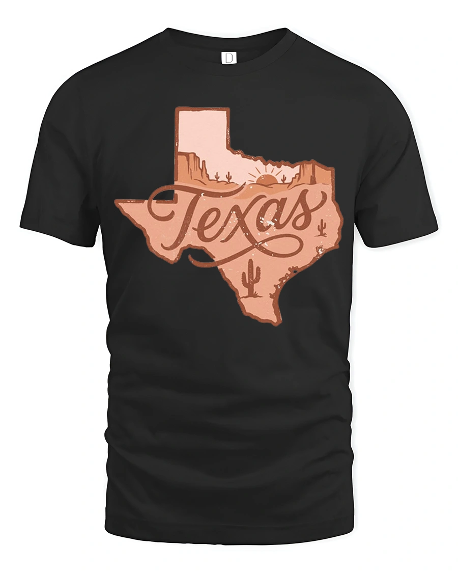 Vintage Texas Desert Landscape Western Style Graphic Tee Tshirt captures the spirit of the southwest through an artistic state outline filled with desert scenery inspired by warm sunsets and rustic western charm.