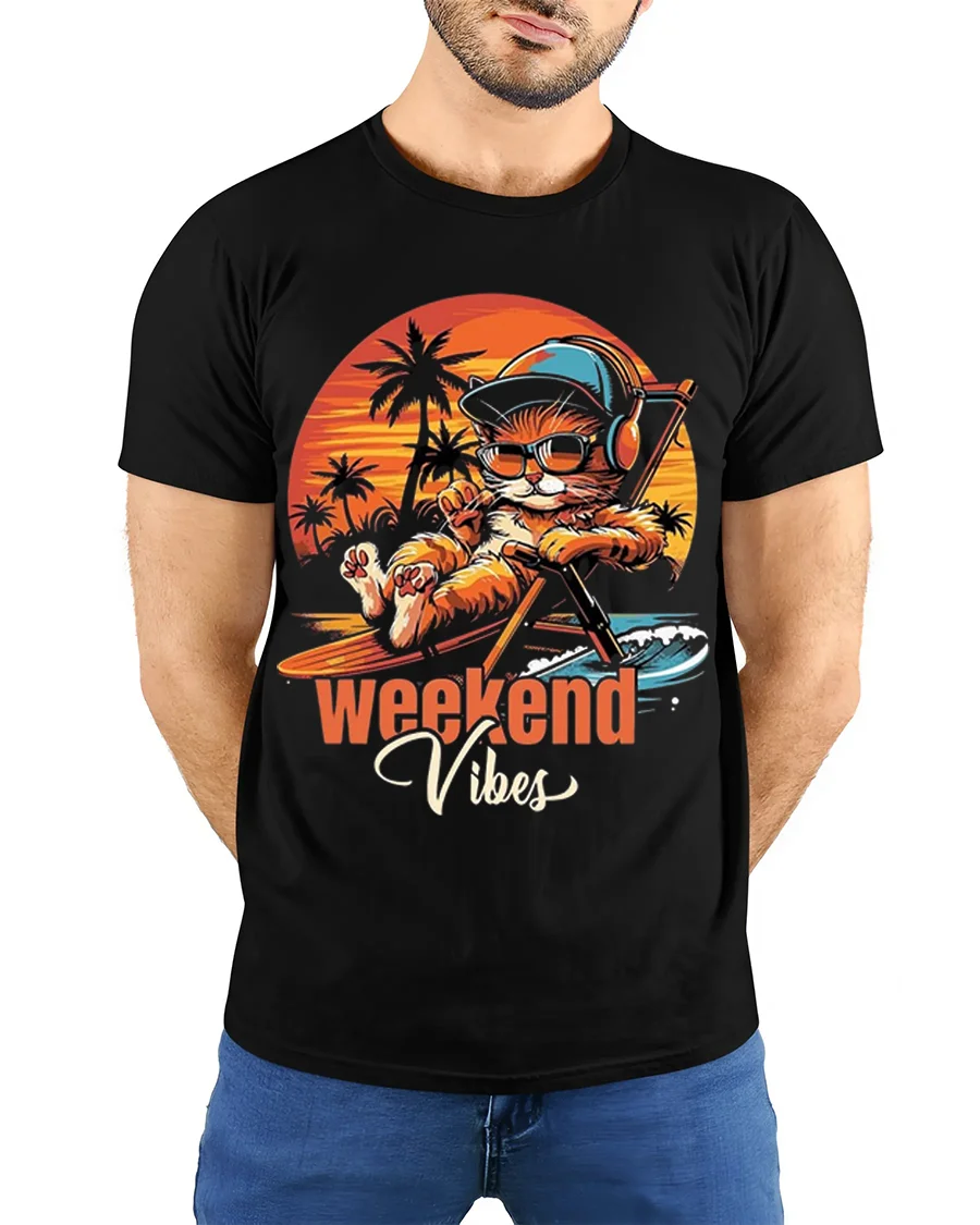 Weekend Vibes Cat Tshirt Retro Chill Sunset Tee is the perfect shirt for anyone who loves relaxing weekends, fun summer vibes, and cool cat graphics. This unique t-shirt features a stylish cat lounging with headphones and sunglasses in front of a vibrant tropical sunset. The playful design captures the laid-back feeling of weekends and gives your casual wardrobe a fresh, retro-inspired look.