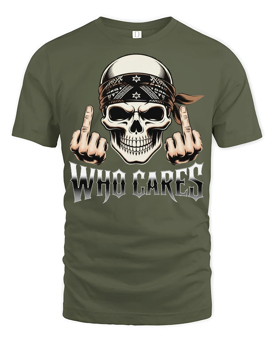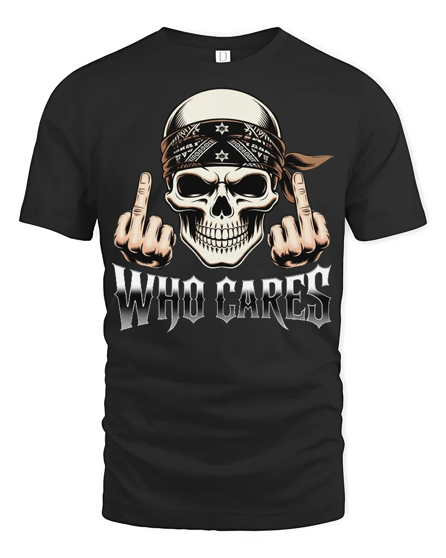 Who Cares Skull Rebel Attitude Graphic Biker Style T Shirt brings bold personality and fearless humor into a striking graphic design.