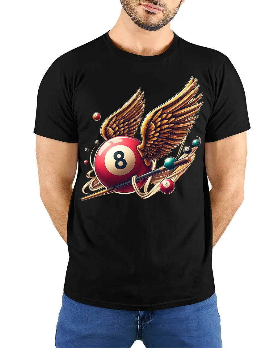 The Winged Eight Ball Pool Billiards Graphic T-Shirt is designed for pool lovers who want to show their passion for the game with bold style. Featuring a detailed winged eight ball surrounded by cues and vibrant motion lines, this billiards graphic tee captures the thrill of every shot and the spirit of the game. The gold-toned wings against the rich black background make the design stand out, giving it a powerful yet artistic look that’s perfect for casual wear.