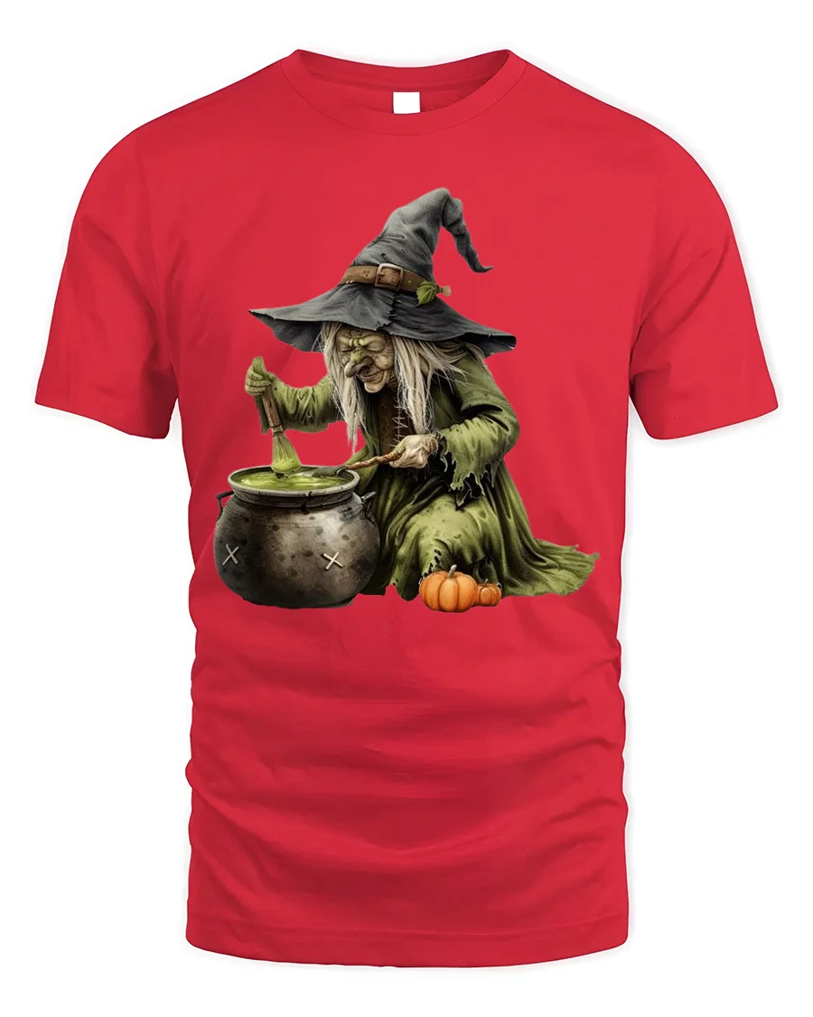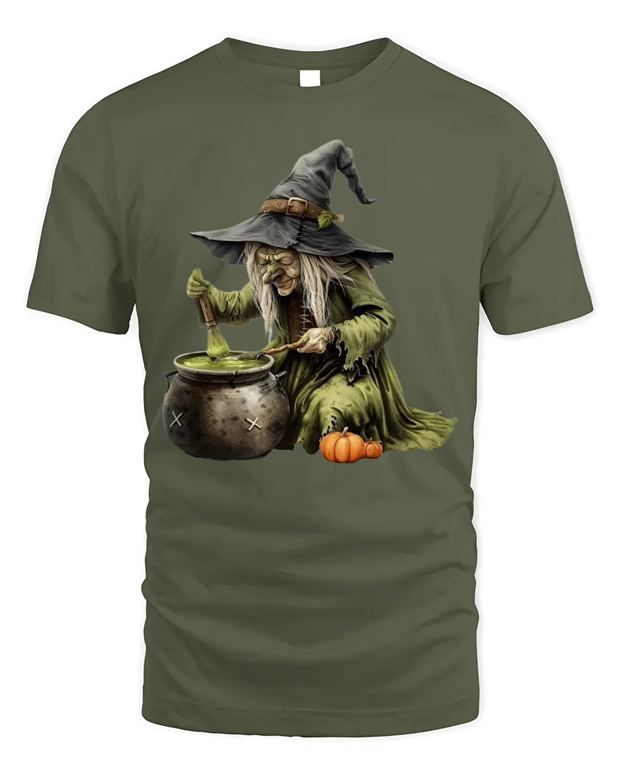 Celebrate the magic of spooky season with this Witch Stirring Cauldron Pumpkin Halloween T-Shirt, a haunting design that brings the spirit of Halloween to life. The artwork showcases a creepy old witch mixing a bubbling green potion in her cauldron, complete with a pointed hat, eerie pumpkins, and dark gothic details. Perfect for those who love witchcraft, horror, and Halloween vibes, this shirt makes a bold addition to any spooky wardrobe.