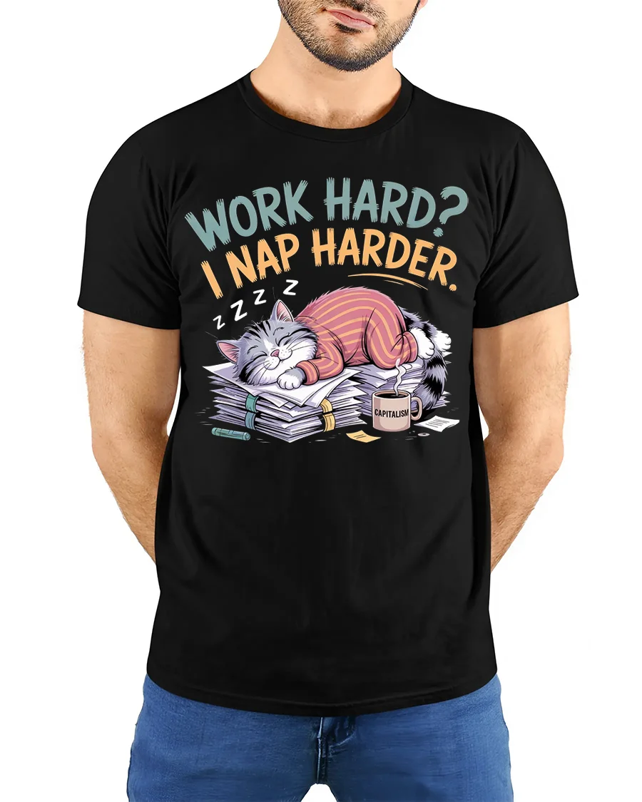 The Work Hard Nap Harder Funny Lazy Cat T-Shirt is the perfect design for anyone who relates more to naps than deadlines. Featuring a cartoon cat in pajamas sleeping on a pile of paperwork with a coffee mug nearby, this witty graphic tee delivers humor, sarcasm, and feline charm all in one. With the playful phrase “Work Hard? I Nap Harder,” it’s sure to get smiles and laughs wherever you go.