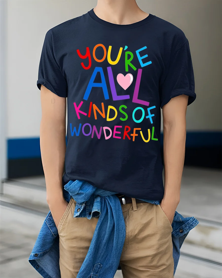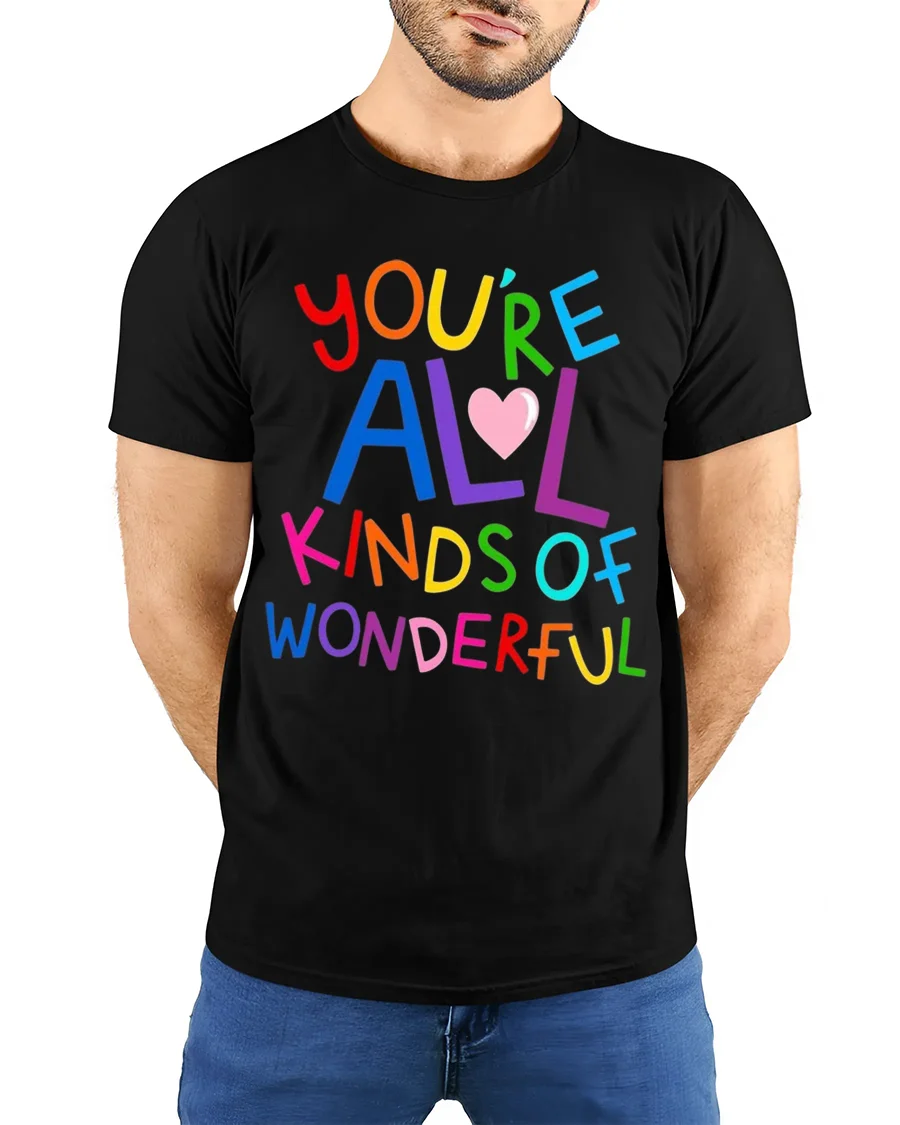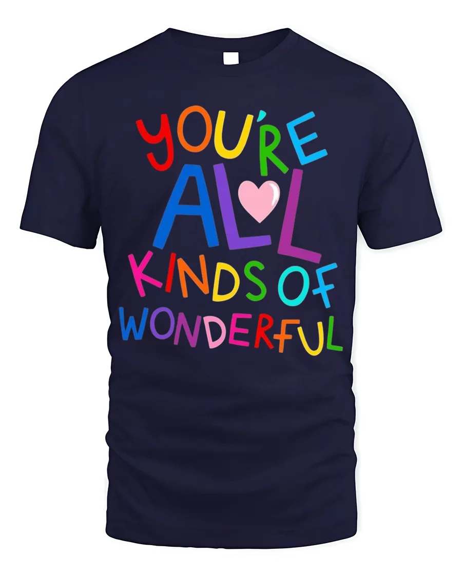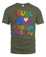 Spread positivity and self-love with our You’re All Kinds of Wonderful Rainbow T-Shirt. This delightful tee features a vibrant, hand-lettered message in a spectrum of rainbow colors, highlighting the empowering phrase “You’re All Kinds of Wonderful” with an adorable pink heart. It’s a perfect way to celebrate individuality and remind everyone of their unique value.