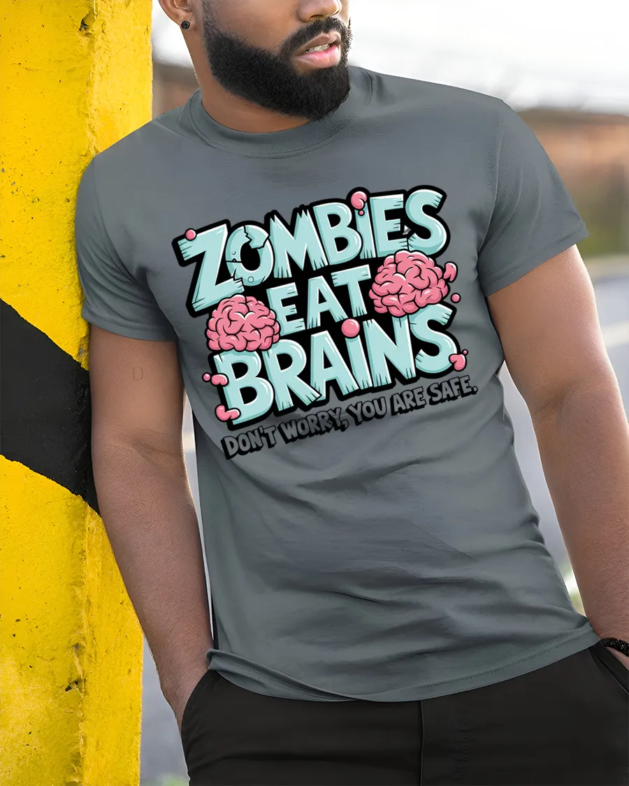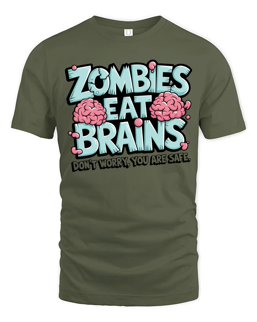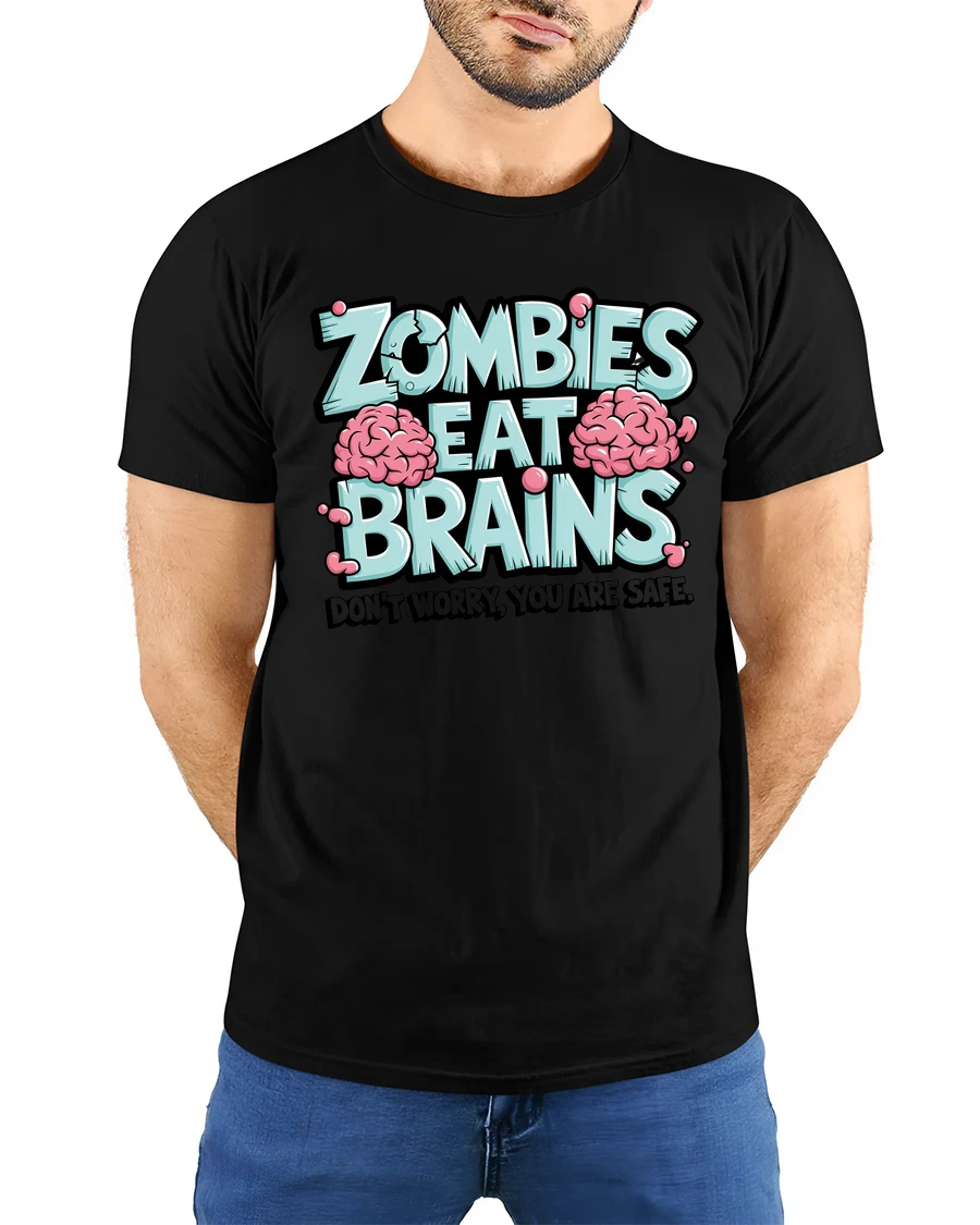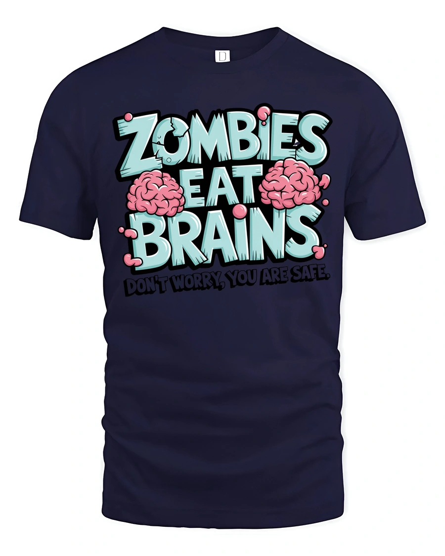 Zombies Eat Brains Funny Zombie Humor Graphic T Shirt is made with soft breathable fabric that feels comfortable all day. The high quality print keeps the bright colors and bold lettering crisp and clear, making the graphic pop with personality. This shirt combines spooky humor and casual style, making it a fun conversation starter that adds a touch of horror comedy charm to everyday outfits and seasonal celebrations.